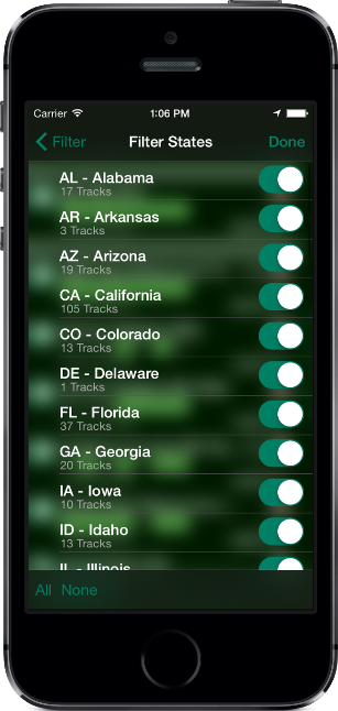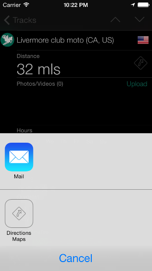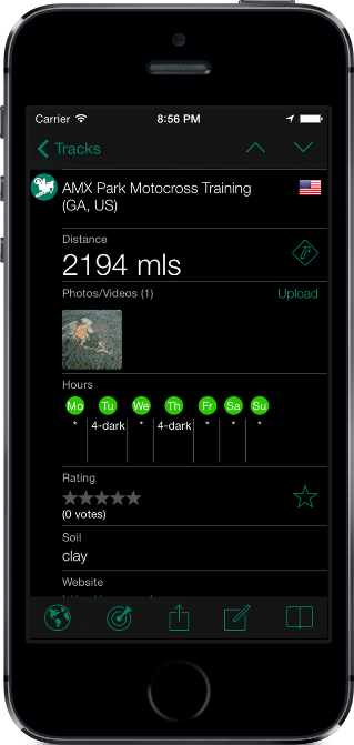 At the bottom of the track's detail you have important functions right under your fingers. See the current track on a map, see other tracks nearby the current one, report changes to the track's info or report a new track, add the track to your favorites list. The "Action button" allows you to send info about the track via email, messages, Facebook and Twitter as well as navigate directly to the tracks entrance gate using the built in Apple Maps app, Google Maps*, TomTom* or Navigon* (* if installed on your device - additional app purchase necessary)
